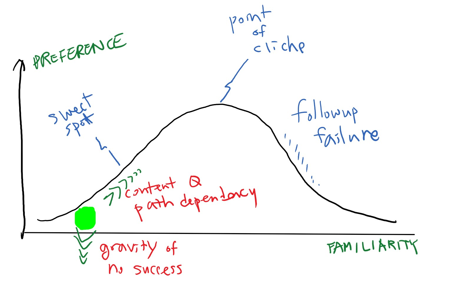익숙함과 참신함의 적절한 배합이 최적점(sweet spot)을 만들고 거기서 더 반복되면 클리셰가 된 후 지루함과 실패로 넘어가는 형상입니다. 즉 히트메이커스의 다양한 설명을 하나의 곡선위에 올려두고, 대중화의 정도에 따라 변화양상을 표현 한게 특징입니다.