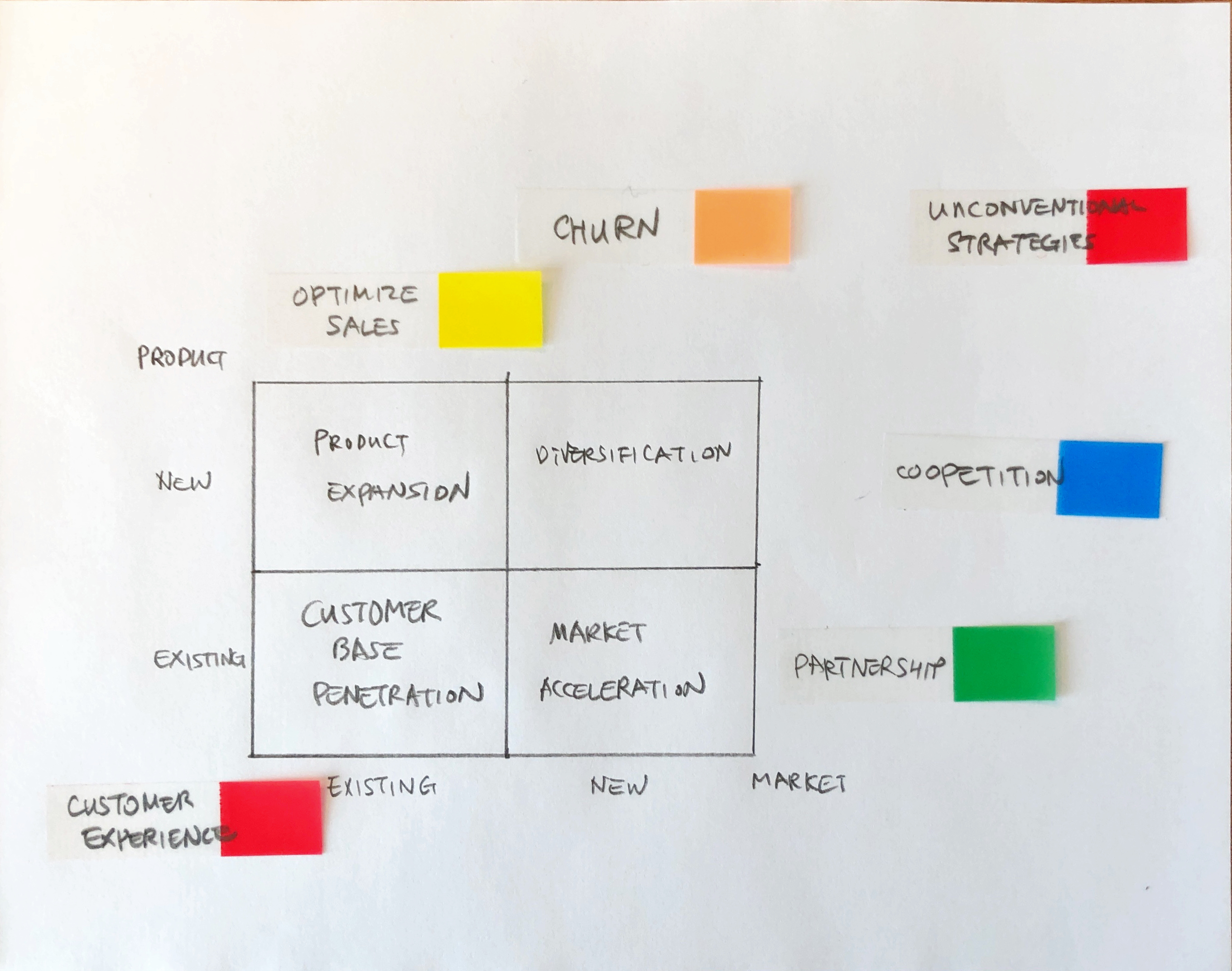 예컨대, 시장침투-시장가속화-제품확장-다각화 는 Ansoff 매트릭스라고 합니다. 이걸 가운데 두고, 제품면에서의 확장을 제휴와 협쟁(coopetition)으로 돕고, 시장의 확장은 영업최적화와 이탈(churn) 방지로 돕는거죠. 근원은 고객경험이고 그 외에는 비전통적 전략입니다. (이렇게 자리매기다보니 외워졌…)