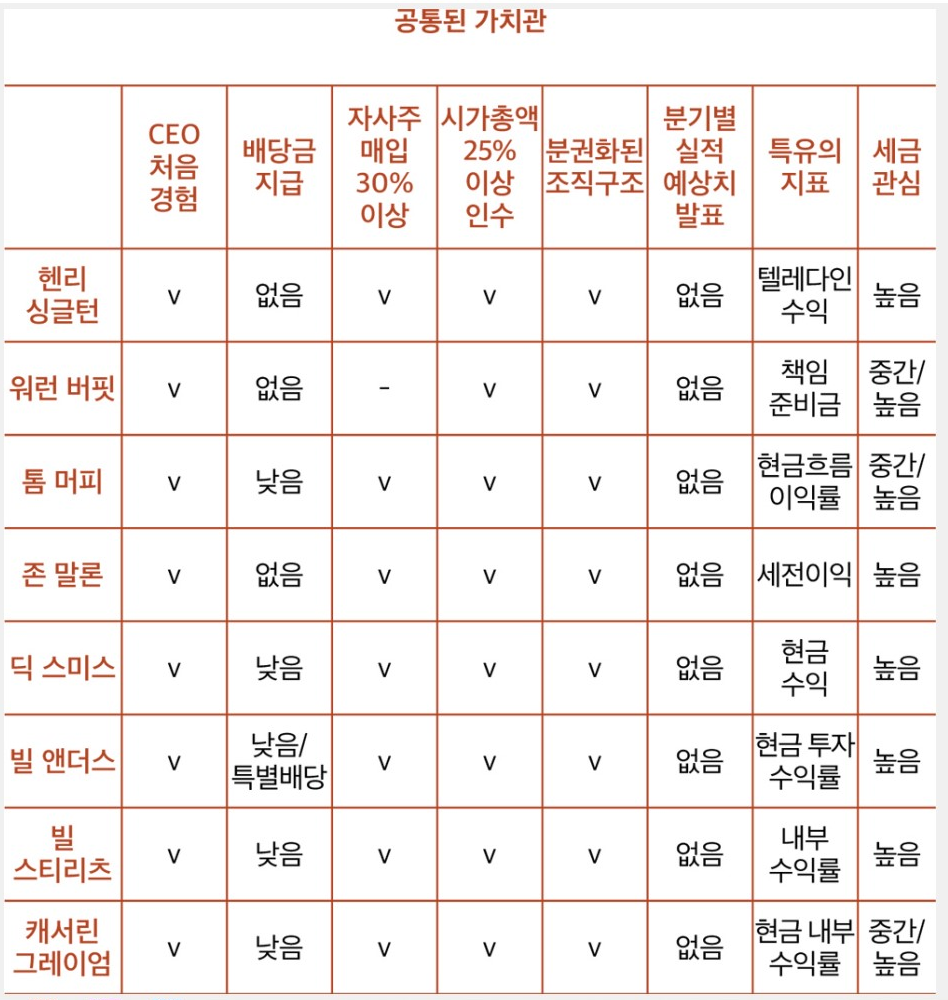 한가지 특기할 부분이 있습니다. 이 여덟 CEO은 따로 떨어진게 아니라 상관관계를 가집니다. 핵심 인물은 워렌 버핏입니다. 그리고 이 패러다임의 원조는 싱글턴입니다. 그의 모델을 배우며 버핏은 벤저민 그레이엄과 결별하고 가치 상승의 마법사로 거듭납니다. 그리고 그의 조언에 따라 톰 머피, 빌 앤더스, 캐서린 그레이엄 등이 자본배분의 철학을 구현하여 업종의 선두를 거머쥡니다.