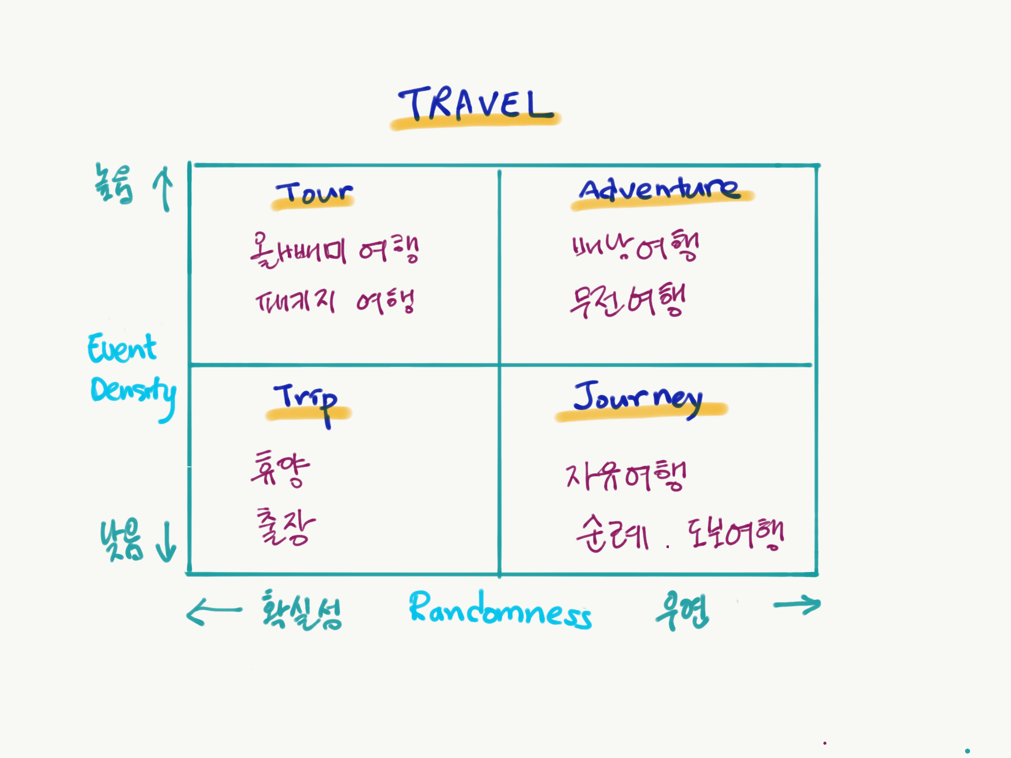 그려놓고 보니, 우리는 여행(travel)이라고 간단히 말하지만, 뉘앙스가 다른 세분화된 영어 표현과도 상응합니다. 단기적이고 단순한 목적의 trip, 대개 정해진 일정이 있지만 다수의 목적지를 돌게되는 tour, 좀 더 장기적이고 목적보다는 여정 중심의 journey, 장기적이지만 최종적인 목표가 있는 adventure가 그 넷입니다.