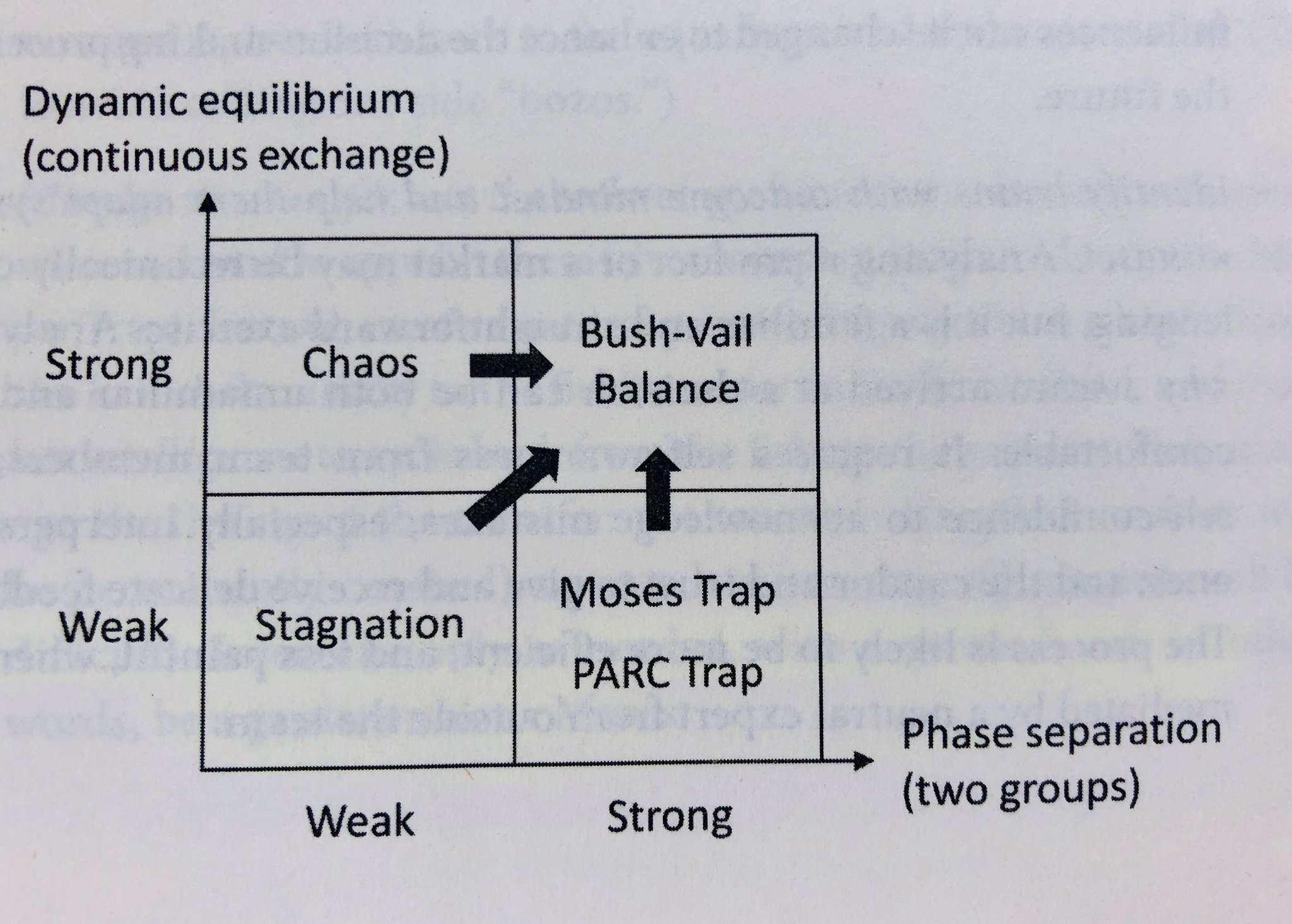 책에서 이상적으로 생각하는건 상분리된 상태에서 서로 동적평형을 이루는 부시-베일(Bush-Vail) 균형입니다. 2차대전 당시, 기술 후진국(!) 미국에 국가주도의 R&D를 도입해, 독일 우세의 전황을 반전시키고 지금까지도 선도적인 혁신의 에너지와 철학을 만든 사람이 부시-베일입니다.