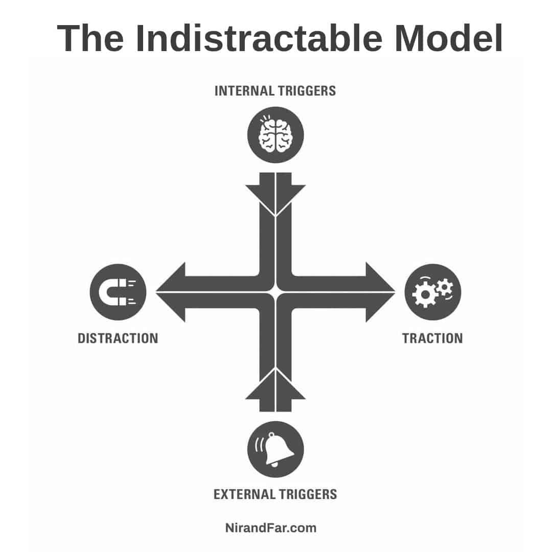 원래 해야하는 본짓(traction)이 있고 이를 방해하는 딴짓(distraction)이 있습니다. 이들은 내부 계기와 외부 계기에 의해 활성화가 된다는 개념 모형입니다. 훅은 외부 계기로부터 야기되는 딴짓에 대한 방어책에 가깝습니다. 초집중은 내부 계기까지 포괄합니다. 그리고 원래 의도한 행동, 본짓의 목적까지 재음미를 합니다.