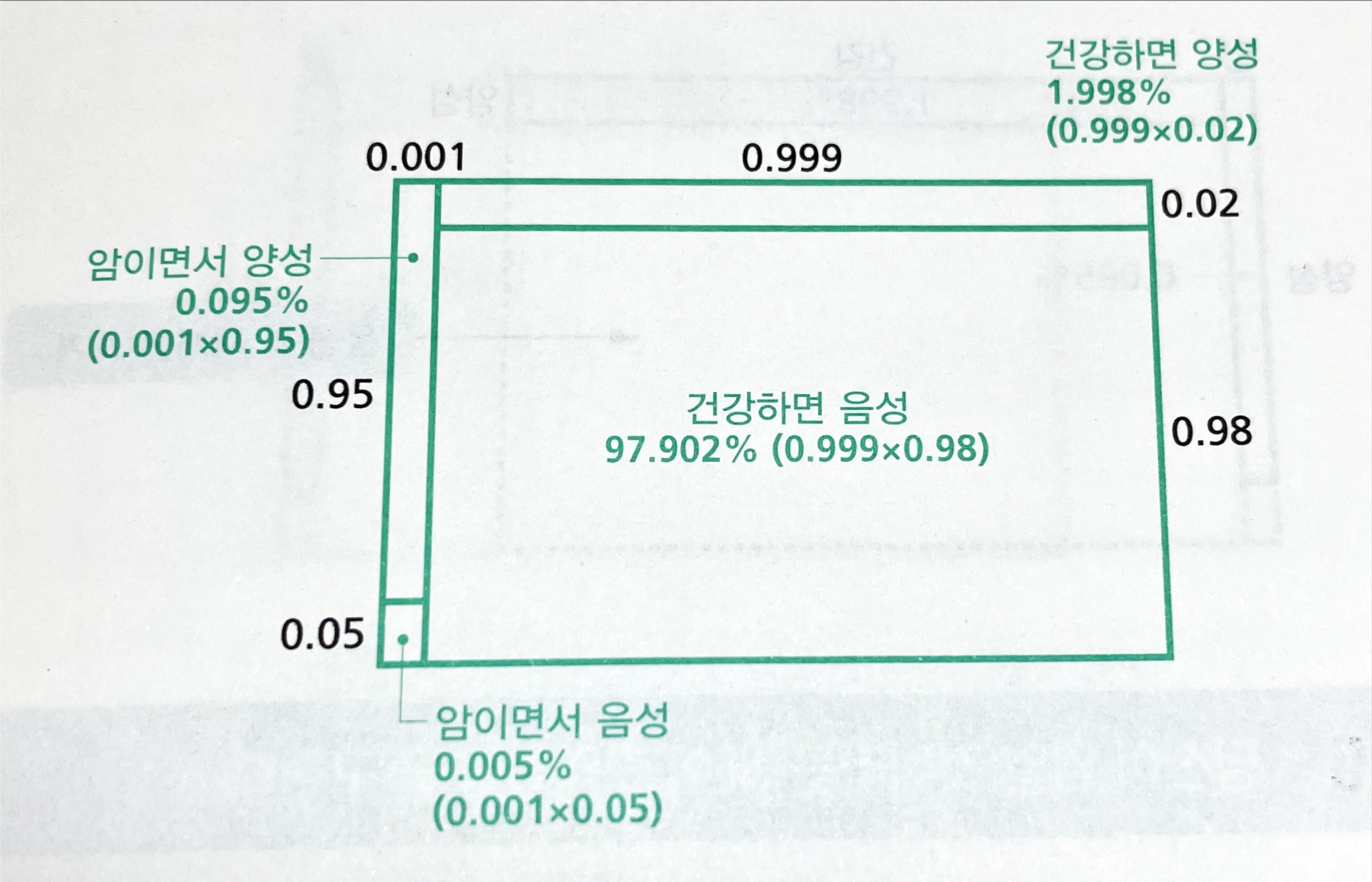 이 병에 걸렸는지 간이검사를 할 경우, 실제 병이 있다면 95% 확률로 양성이 나옵니다. 단, 간이진단이기 때문에 건강한 사람이 양성이라고 오진될 확률은 2%가 있습니다.