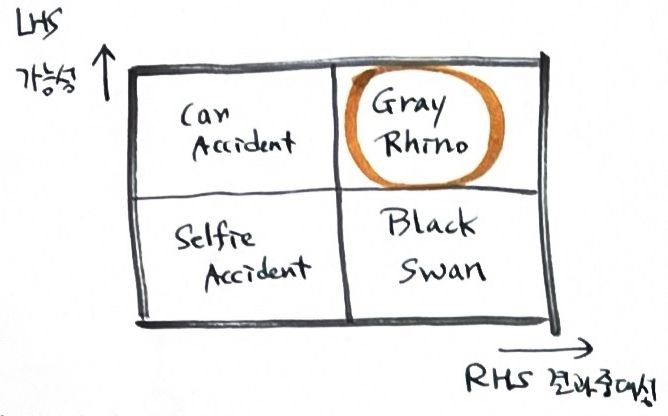 발생확률은 낮지만 터지면 문제 심각한 사안이 블랙스완이라면, 책의 시선은 발생확률이 높으면서도 결과가 심대한 이벤트에 가 있습니다. 회색 코뿔소라 부르는데, 모두가 알지만, '당장은 아니고 언젠가…' 라는 생각 때문에 대응은 미비합니다. 혹여 열심히 대응 하더라도, 모든 문제를 원천적으로 막기는 불가능할 수도 있습니다.