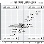 오늘 아침 중앙일보에 흥미로운 설문결과가 실렸습니다. 24개 파워조직의 영향력과 신뢰도를 조사한 결과인데, 자세한 사항은 기사를 참조하시면 됩니다. 1543명 전화 설문의 결과야 딱 그 정도로만 새겨들으면 되는데, 굳이 포스팅까지 하는 이유는 예전 일이 생각나서입니다. 1995년인가 이건희 회장이 베이징에서 '기업은 2류, 정부는 3류, 정치는 4류'라는 발언을 한 후 엄청난 설화를 겪었었지요. 애초의 뜻은 정치 쪽에 도움받기도 힘드니 기업들의 갈길이 멀다고 분발을 촉구하는 것이었지만, 당시 정계에서는 엄청 발끈하여 '기업이 무슨 2류냐? 4류, 5류다' 라며 순서 다시 매기기에 골몰해서 국민들의 빈축을 샀었습니다. 이 결과를 보니 여전히 세개의 그룹으로 나눠 볼 수가 있겠네요. 그리고, 10년전의 일이..